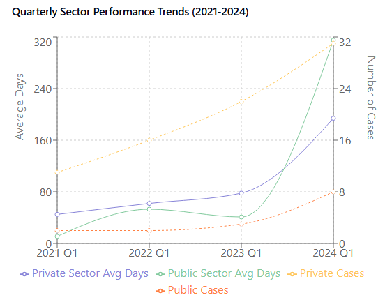 Public sector performance shows more volatility and a significant increase in processing times over the study period.
